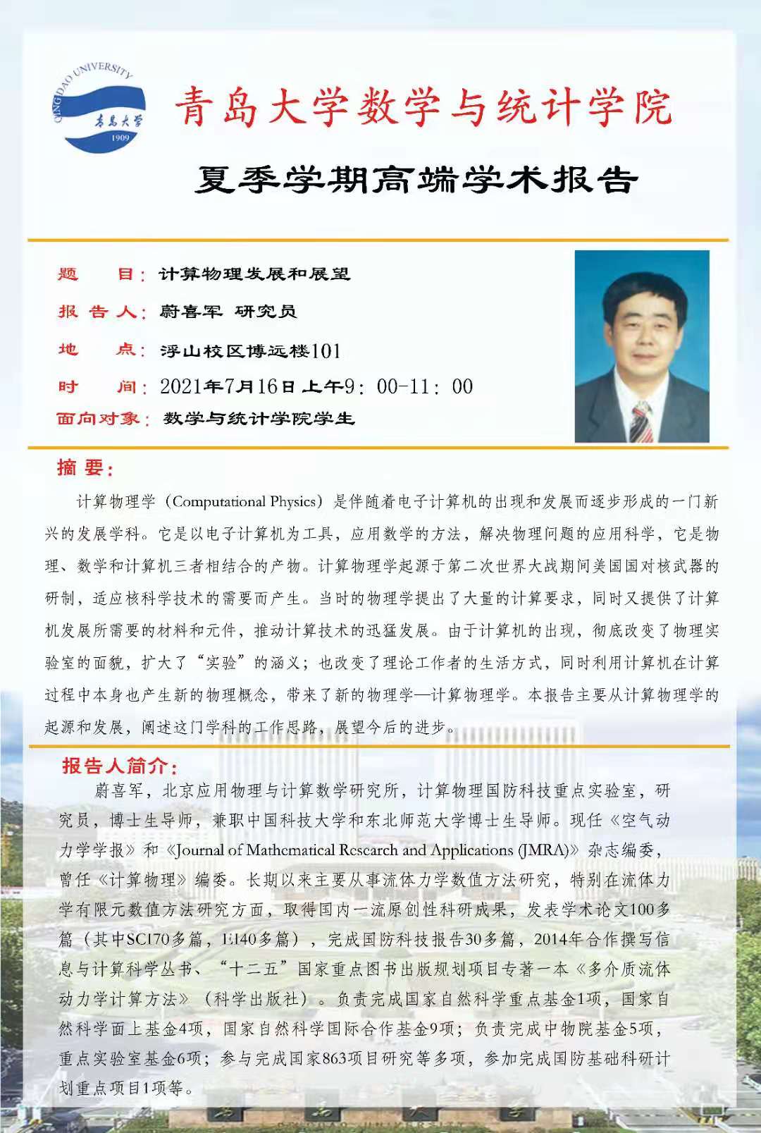 2021年7月16日9:00-11:00,Beat365中文官方网站夏季学期第四场高端学术报告在博远楼101教室举行,来自北京应用物理与计算数学的蔚喜军研究员为Beat365中文官方网站师生作了题为“计算物理发展和展望”的学术报告,介绍了计算物理的历史和未来的发展。
