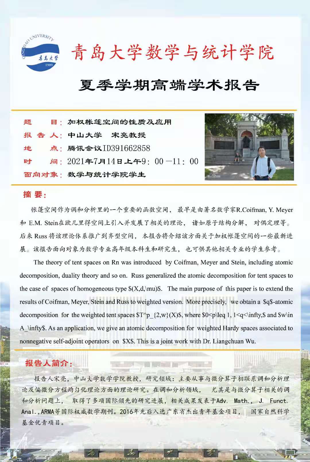 2021年7月14日9:00-11:00,Beat365中文官方网站夏季学期第三场高端学术报告在线上举行,来自中山大学的国家优秀青年基金获得者宋亮教授为Beat365中文官方网站师生作了题为“加权帐篷空间的研究”的学术报告,介绍了加权帐篷空间的发展历史和研究现状,以及一些最新的科研工作。
