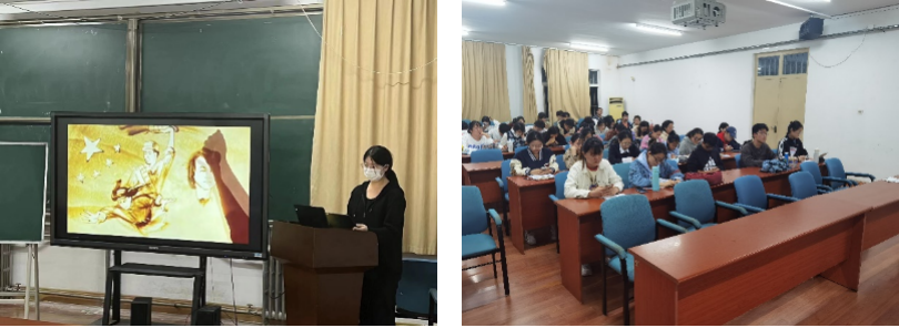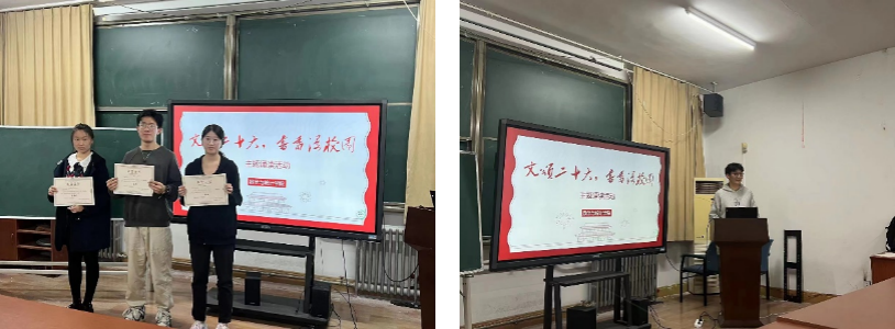 本次活动分为红色书目、电影名接龙和诵读分享两个环节。在第一环节中同学们积极踊跃参与活动,才思敏捷,红色书目和电影名随口道来。经过几轮激烈角逐,最终十一位同学上台分享。