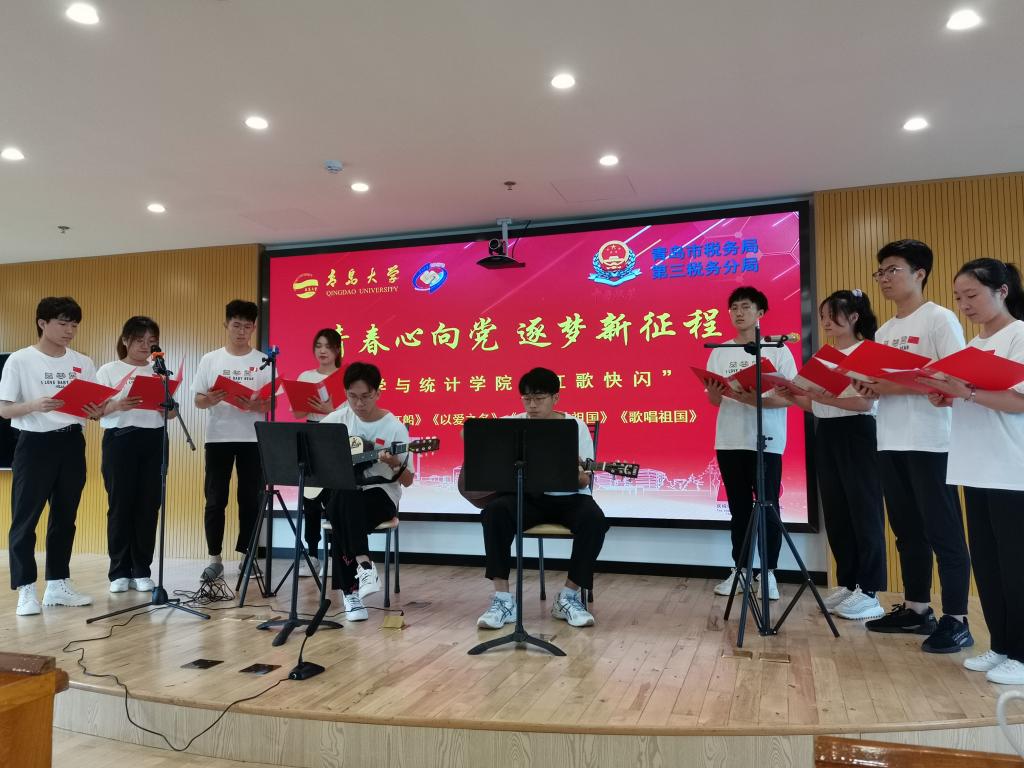 在税务局第三分局四楼会议室,分局党总支副书记、副局长杨建武致欢迎辞,随后,学院学生代表带来了“青春心向党,筑梦新征程”红歌快闪节目。在2名同学吉他伴奏中,8名同学分别唱响《以爱之名》、《百年红船》等红色主题歌曲,以及齐声朗诵《我和我的祖国》、《少年少年》等诗歌,同学们感情饱满情绪激昂,传递出建党百年之际当代青年奋进新时代的磅礴力量。