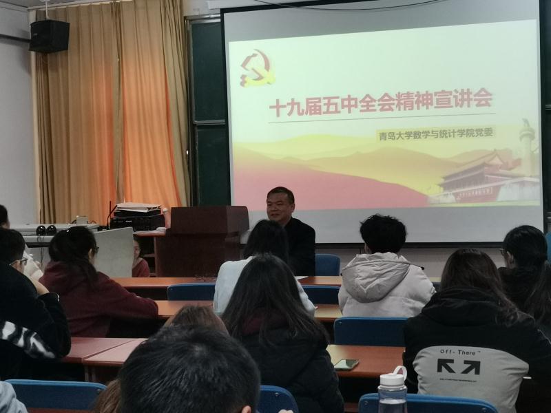 12月11日,数学与统计学院学习贯彻党的十九届五中全会精神宣讲会在励行楼302举行,Beat365中文官方网站党委书记姜永杰对全会精神作出深度解读,各教工党支部代表和学院大学生习研会全体成员到场参加。