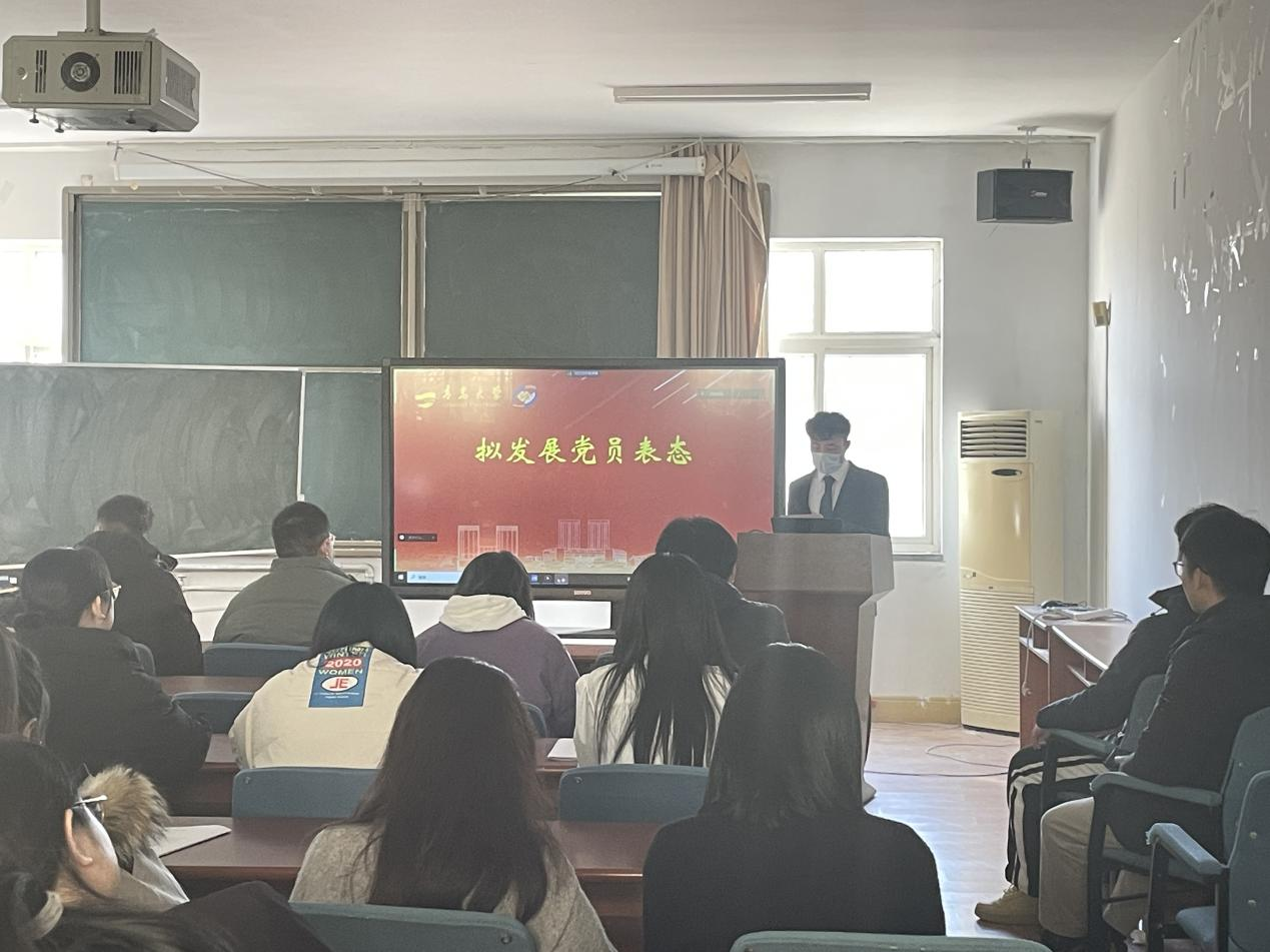 会议在庄严肃穆的国歌中开启,支部书记朱雨彤清点到会人数,宣读拟发展预备党员名单。发展预备党员依次上台汇报对党的认识、入党动机、家庭和社会关系情况以及需要向党组织说明的问题。 随后,入党介绍人拟发展预备党员的现实表现情况进行介绍,并对其能否入党表明意见。之后,支部副书记杨艺代表支部委员会报告对拟发展为预备党员的审查情况。在此基础上与会党员发表意见,结合实际情况对发展对象能否入党进行充分讨论。随后有表决权正式党员对殷博文等22名党员发展对象能否发展成为中共预备党员进行无记名投票。经过大会投票表决,一致同意吸收殷博文等22名党员发展对象为中共预备党员。