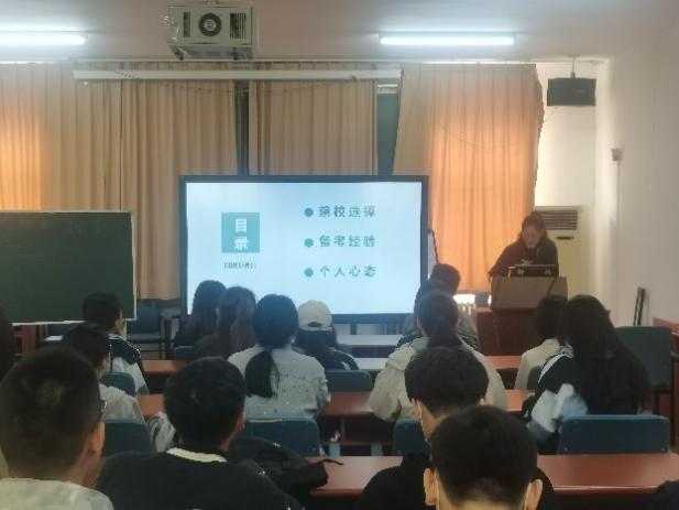 刘骁和赵菲两位同学以PPT的形式分享了自己考研的心路历程,包括考研学校的选择方法,各科的复习规划以及冲刺阶段的心态。胡晓颖同学首先向大家解答了学硕与专硕的区别,然后她结合自身经验,教给大家如何高效搜集所需的考研复习资料。