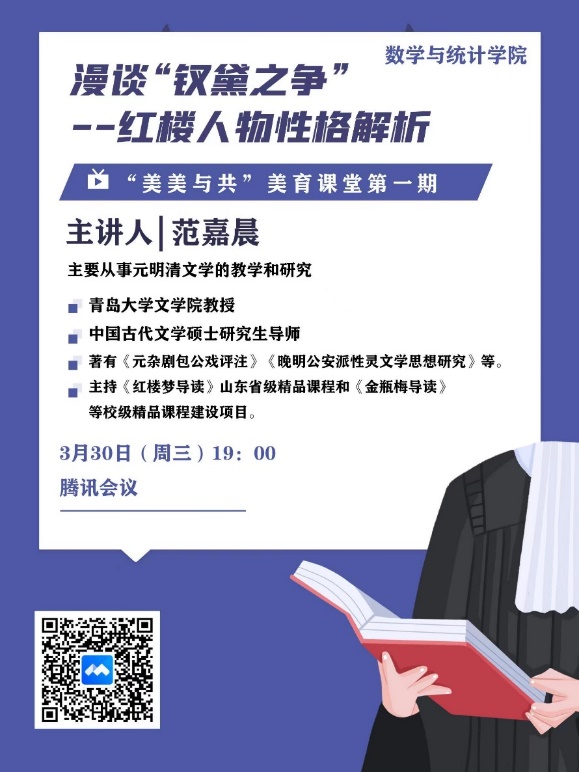 3月30日晚19:00,Beat365中文官方网站举办“美美与共”线上美育课堂,邀请Beat365中文官方网站优秀教授文学院范嘉晨教授为全体师生带来一场别开生面的文学讲座——红楼人物性格解析之漫谈“钗黛之争”。Beat365中文官方网站党委副书记张雪蕾主持讲座。