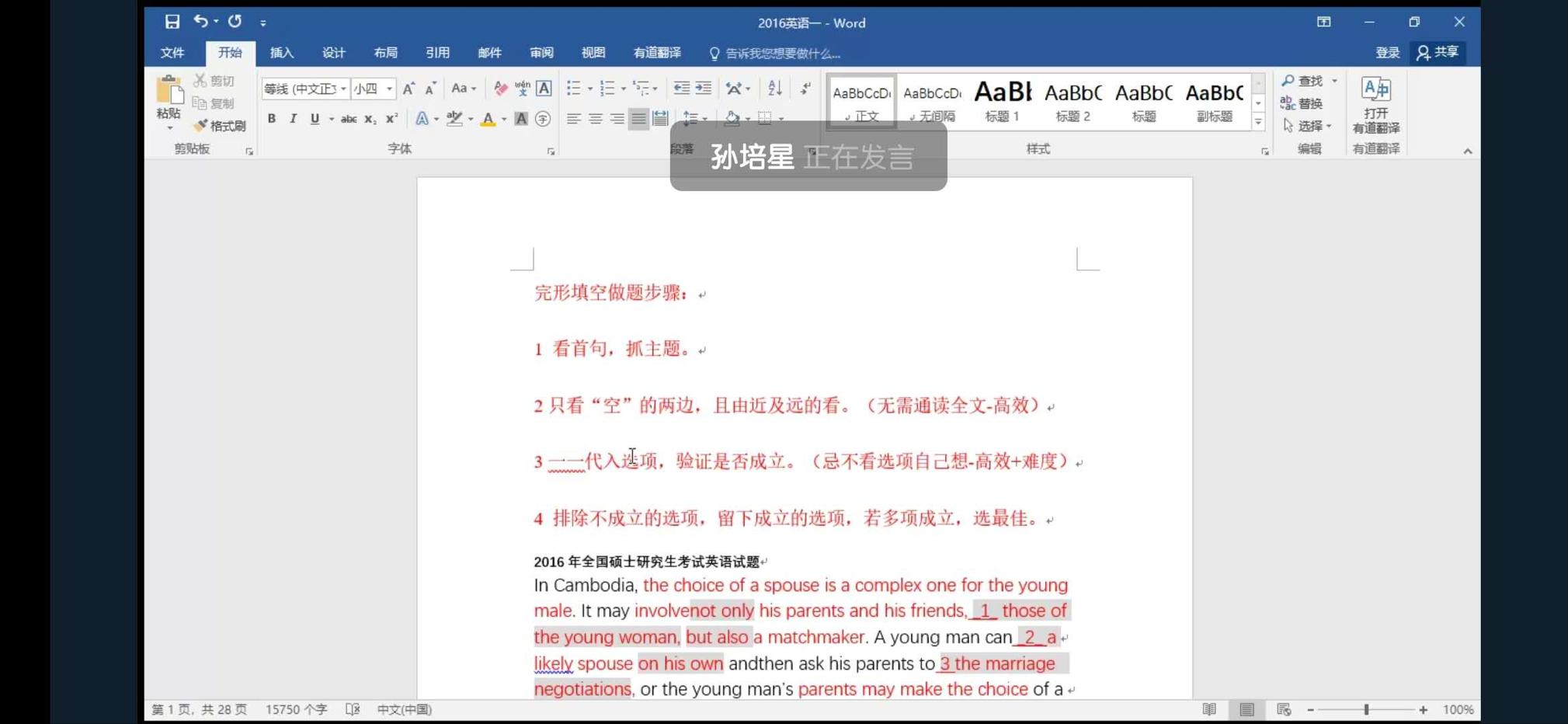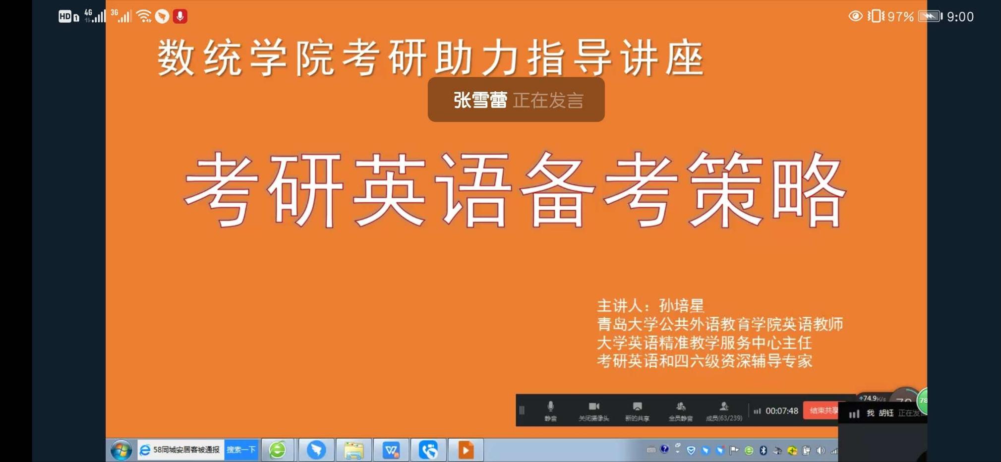 7月9日上午,Beat365中文官方网站以钉钉线上视频的方式举办第一期“考研助力”主题讲座之考研英语备考策略讲座。公共外语教育学院大学英语精准教学服务中心主任、考研英语和四六级资深辅导专家孙培星老师主讲,2017级考研学生和部分备考六级的同学参加,讲座由学院党委副书记张雪蕾主持。