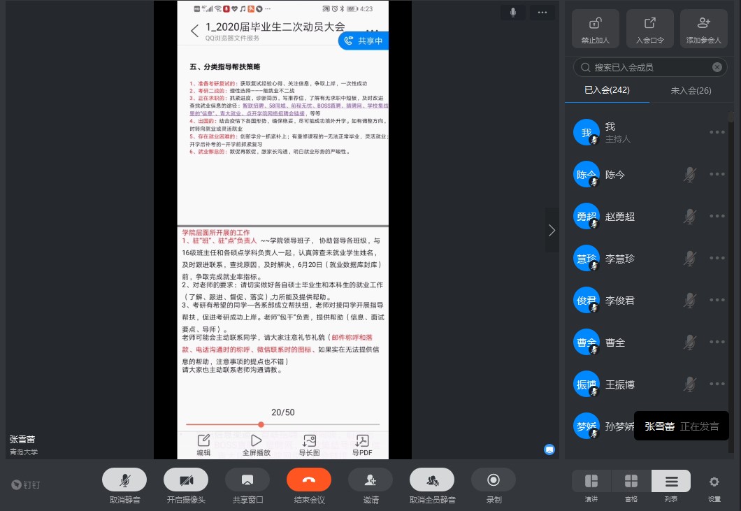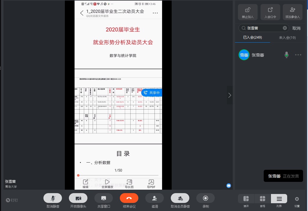 张雪蕾从今年国内外疫情形势出发,从两个方面进行分析介绍:1.结合往年本科生就业数据,指出当前国际形势下经济呈现下行态势,岗位招聘数锐减,毕业生面临巨大就业压力;2.研究生扩招机会难得,考研毕业生应抓住这次机会,争取一次成功上岸,避免“盲从”二战。随后,她介绍了学院层面为促进就业所开展的工作,并提出针对不同同学的分类指导帮扶策略,鼓励有需求的同学主动与结对老师沟通联络。