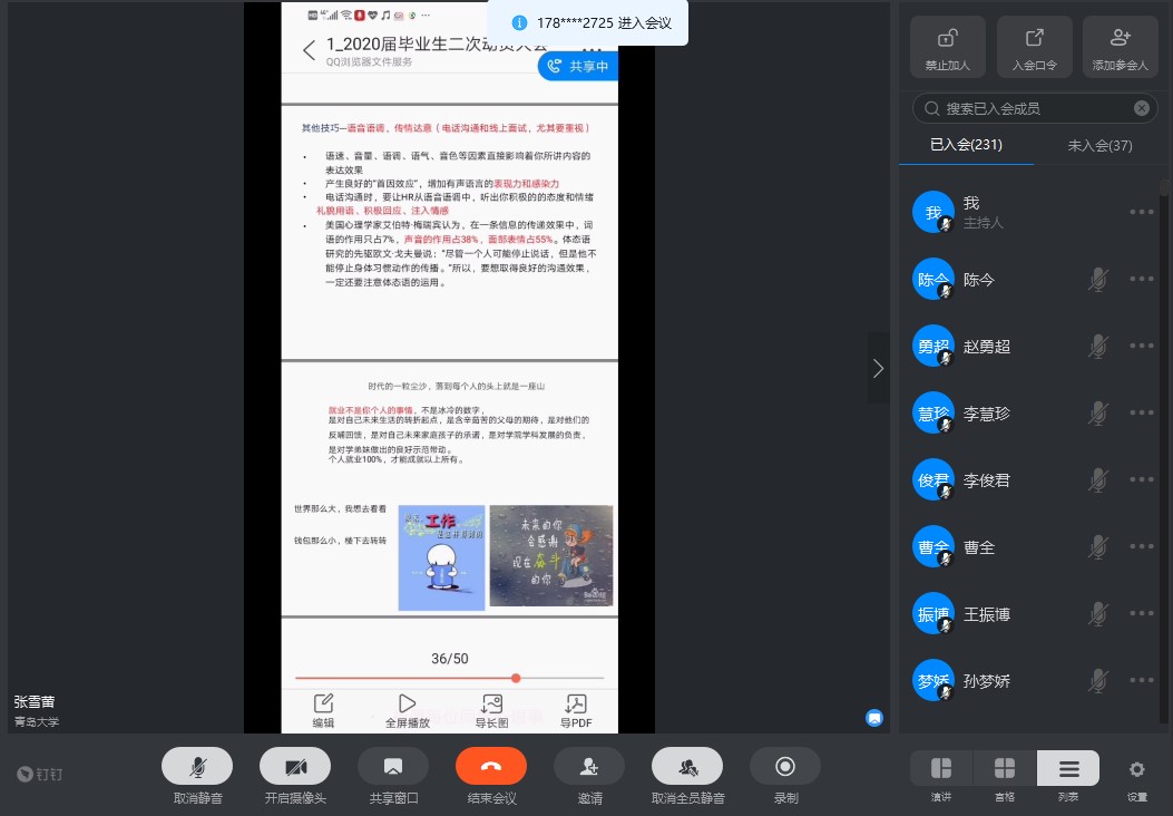 最后,张雪蕾结合今年特殊形势,为毕业生开展了线上面试的专题辅导,从自我介绍、通用面试、小组群面、终面等方面给出了面试建议,并指出了几类行为底线,帮助毕业生提升面试成功率。