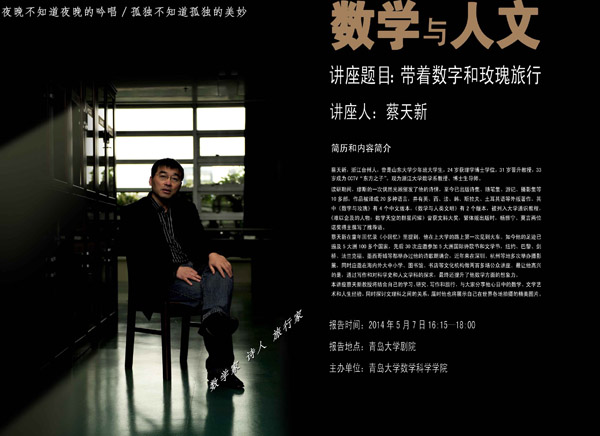 本讲座蔡天新教授将结合自己的学习、研究、写作和旅行,与大家分享他心目中的数学、文学艺术和人生经验,同时探讨文理科之间的关系,届时他也将展示自己在世界各地拍摄的精美图片。