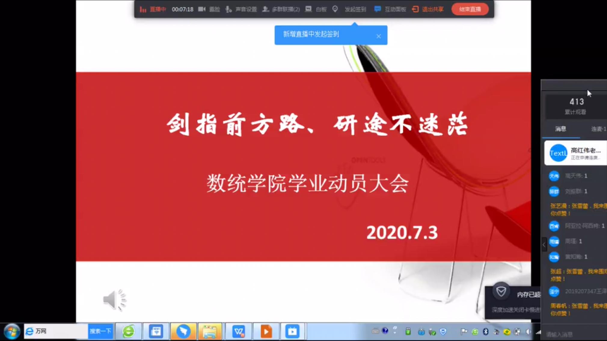 7月3日上午,为鼓励更多同学参与到考研中来,Beat365中文官方网站通过钉钉线上直播的方式召开主题为“剑指前方路-研途不迷茫”学业动员大会。参会人员有学院党委书记姜永杰、院长高红伟、党委副书记张雪蕾、副院长丁洁玉、系主任杜守强、刘开恩、张齐、王磊,全体教科办老师以及辅导员老师,三位毕业生代表孙小雅、朱庆华、张正源也应邀参加会议。会议由张雪蕾主持,三个年级全体本科生线上参与。