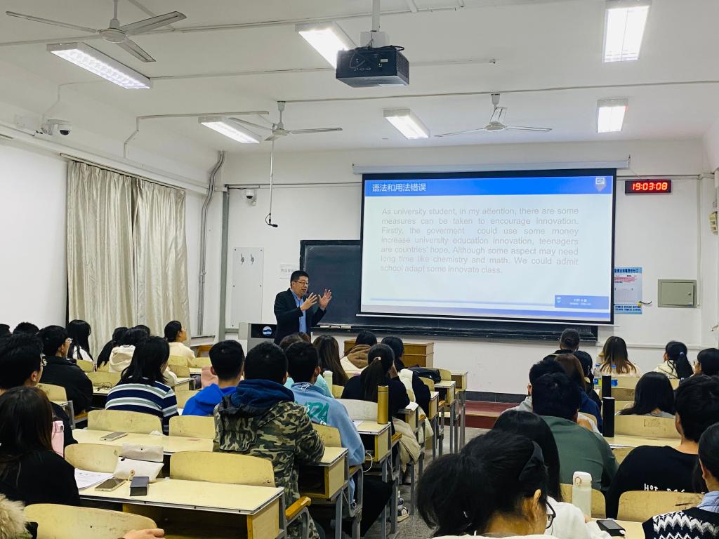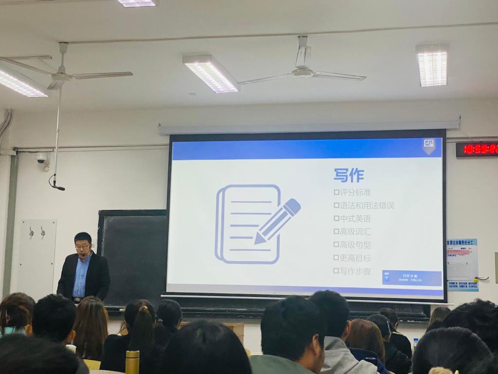 孙老师首先从作文这个大板块讲起,给同学们列举了一些写作中容易犯的错误,并讲述了一些解决方法和常用的表达技巧。接着,孙老师以期中考题和往年四级真题为例给同学们介绍了选词填空简单快捷的解题方法。最后,孙老师表达了自己对同学们的美好期望,祝愿大家都能取得优异成绩!