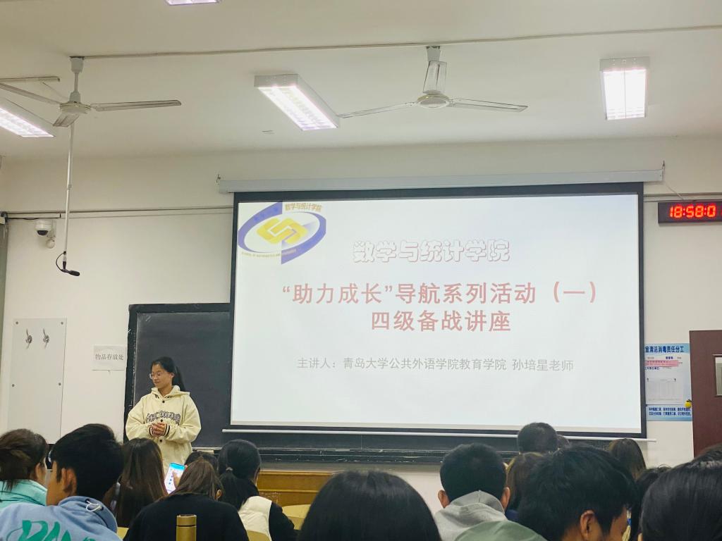 11月15日晚,为帮助同学们科学有效备战四六级考试,Beat365中文官方网站在浮山校区博知楼306举办了“助力成长”导航系列活动(一)四级备战讲座,本次讲座邀请到了Beat365中文官方网站公共外语教育学院英语老师孙培星老师。