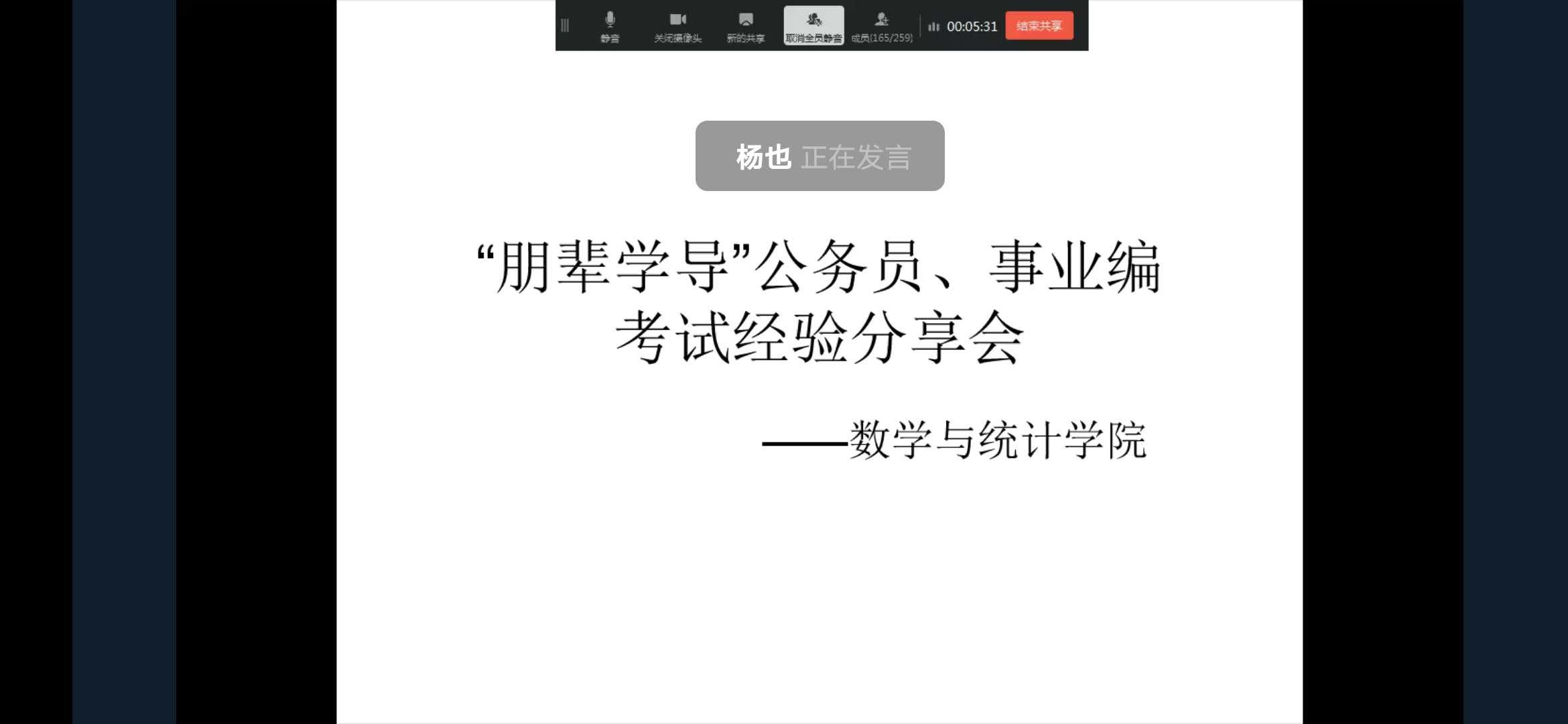 杨也通过PPT向同学们分享考试经验。他首先介绍了公务员、事业编考试的安排,特别强调了应届毕业生身份的优势,提醒同学们提前规划,明确目标。