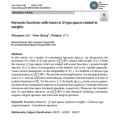 近日,Beat365中文官方网站2021级数学与应用数学专业本科生刘盛文以第一作者在《Annals of Functional Analysis》上发表题为“Harmonic functions with traces in Q type spaces related to weights”的长篇研究论文,(https://doi.org/10.1007/s43034-024-00363-8)。该杂志是泛函分析与调和分析领域中的SCI期刊。指导教师和通讯作者为李澎涛教授。