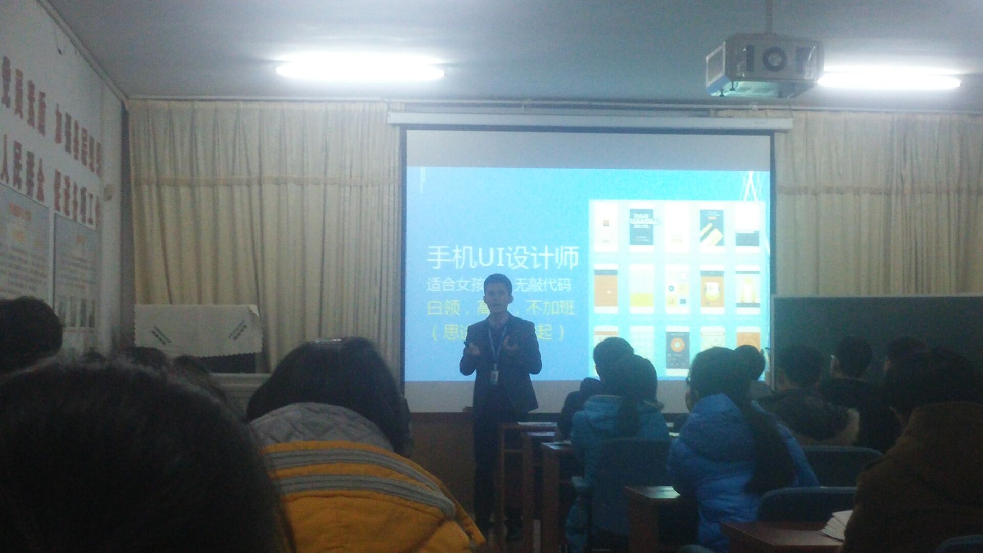 宣讲会开始前,辅导员王彦做了简短的就业动员,鼓励同学们更加主动的去了解就业市场和目标行业的真实现状。随后,徐老师在大家的热烈掌声中开始了宣讲。他从当前大学生的思想出发,先简单介绍了软件行业的发展和现状以及思途天誉教育咨询有限公司的工作范围,结合个人经历阐述“我深知不努力我什么都不是”的观点,让台下的同学们感慨颇深。之后,数科院2013级同学在徐老师的带领下,结合公司的发展历程和战略部署,清楚的明白了移动互联网时代中软件行业的重要地位。最后,徐老师细致的讲述了现在互联网时代的现状,分析了当前大学生的就业情况。