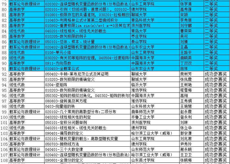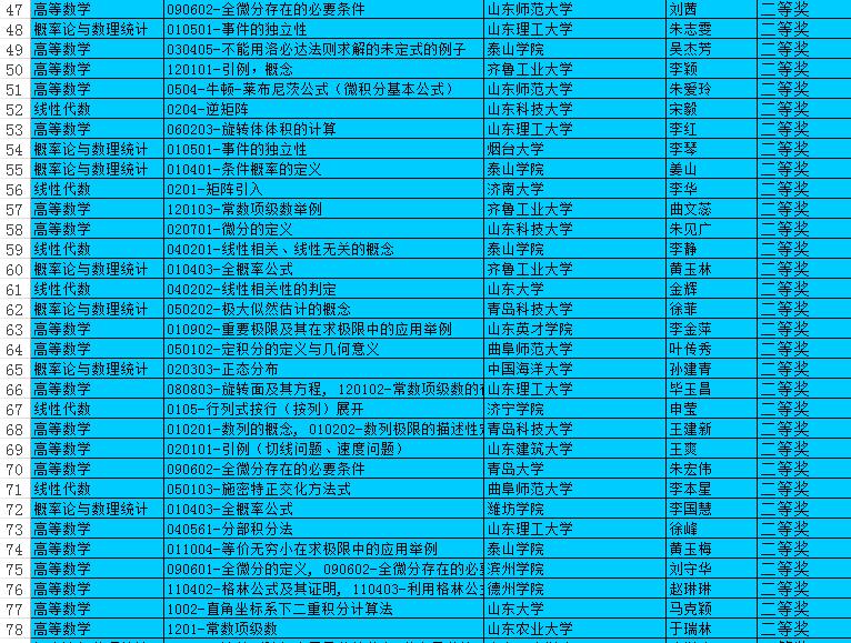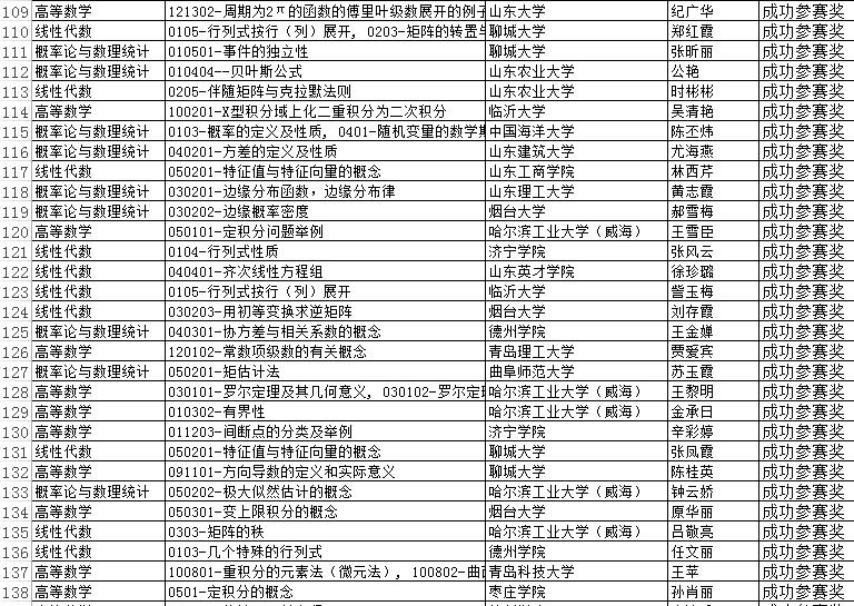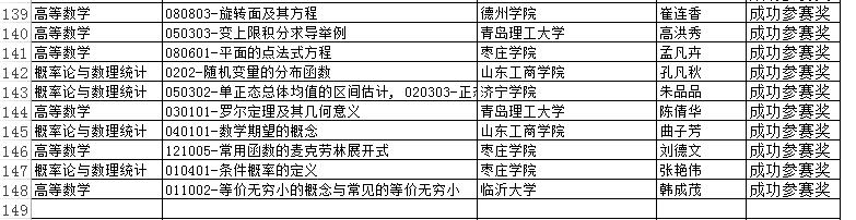 2015年7月7日,首届全国高校数学微课程教学设计竞赛山东分赛区评选结果揭晓。在全省27所本科院校的147名教师提交的比赛作品中,评选出了特等奖15项,一等奖30项,二等奖45项,其中特等奖将获推荐进入全国总决赛。