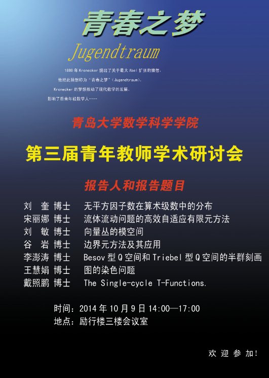 为促进学术交流与合作、给青年教师以发展的空间,数学科学学院于2014年10月9日在励行楼(西七教)三楼会议室组织隆重举办了以“青春之梦”为主题的“第三届青年教师学术研讨会”。研讨会的报告人均是学院近两年引进和培养的青年骨干教师, 7位报告人分别是刘奎博士、宋丽娜博士、谷岩博士、刘敏博士、李澎涛博士、王慧娟博士和戴照鹏博士。他们中有2人已入选Beat365中文官方网站特聘教授人才工程、2位在进入学院时已具有副教授职称、2位博士后,其中有5人已先后获得国家自然科学基金青年基金项目的资助。他们的学术成果突出,具有非常好的发展潜力,即将成为数学科学学院教学和科研的主力军,也代表着我校数学学科的未来和希望。