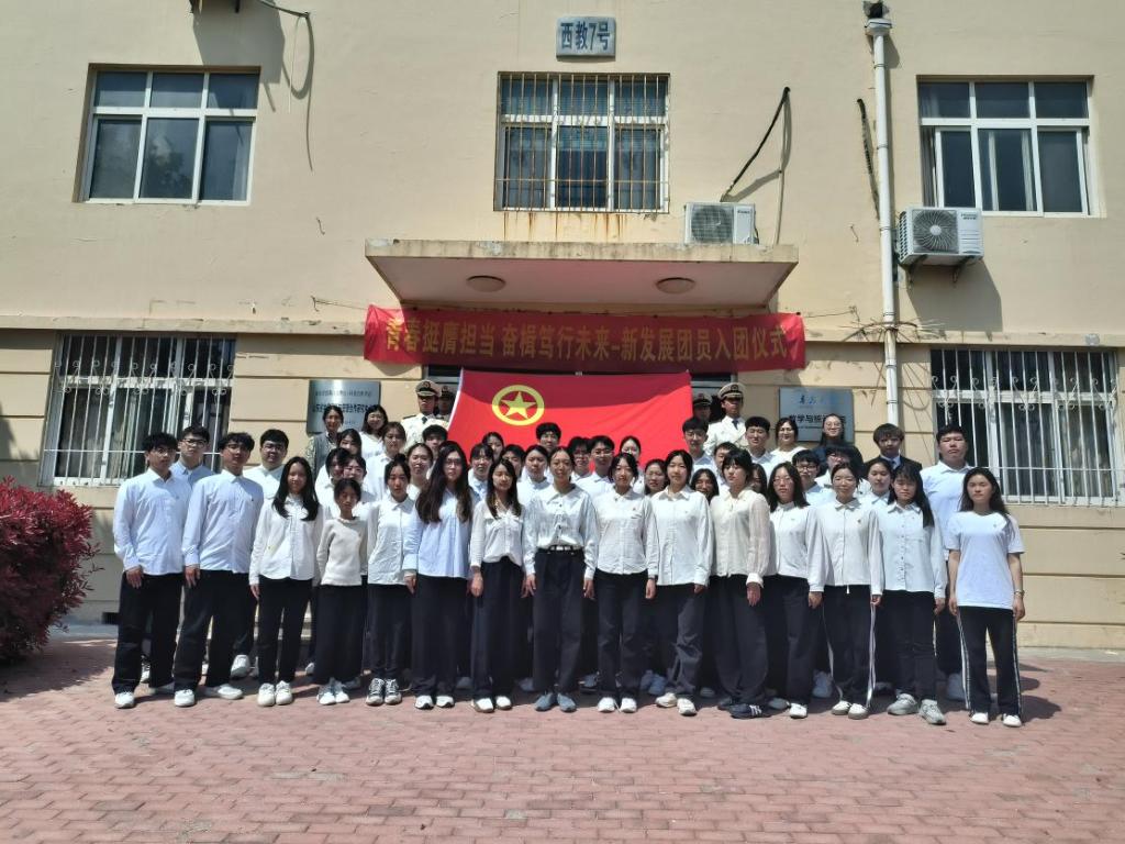 入团仪式在国旗班护送国旗庄严入场后正式开始,在五星红旗的见证下,全体人员肃立,共唱国歌。仪式上,宣读新发展团员名单后,各团支部优秀团员为新团员佩戴团徽。随后新团员进行了宣誓,他们高举右手,目光坚定、慷慨激昂,立志为共产主义事业奋斗。