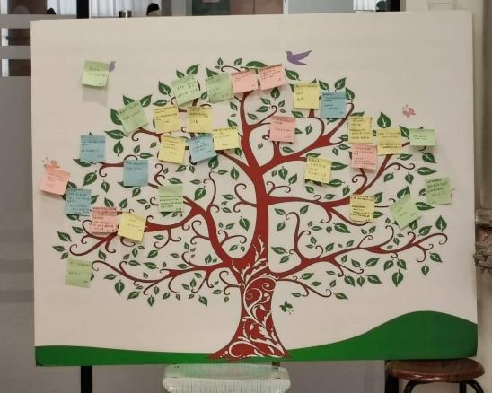 班级首先开展时光胶囊复盘活动。同学们写下“上学期最骄傲的事”和“下学期最想突破的事”,将这些承载个人成长轨迹的便利贴贴在许愿树上,以寄托自己对未来的展望。